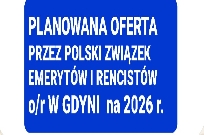 Zamieszczamy podstawowe informacje o PLANOWANEJ OFERCIE przez POLSKI ZWIĄZEK EMERYTÓW I RENCISTÓW O/R w GDYNI NA 2026 r. Planowane wycieczki 1-dniowe i kilkudniowe. ZAPRASZAMY DO ZAPISÓW